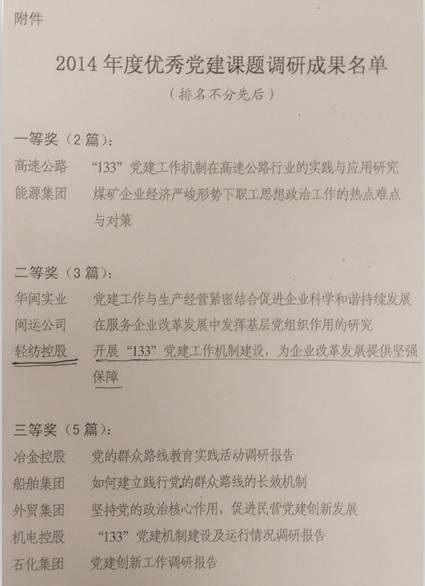 根據閩國資黨委〔2015〕56號文件通知,公司2014年度黨建調研課題《開展“133”黨建工作機制建設,為企業改革發展提供堅強保障》獲省國資委調研成果二等獎。這是公司領導高度重視,廣大黨員干部積極參與的結果,也是省國資委對公司開展推進“133”黨建工作機制工作的充分肯定。