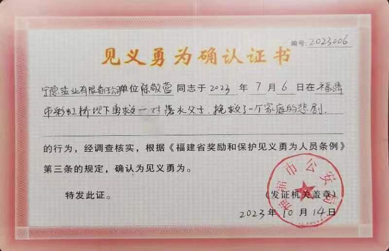 陳敬營同志7月6日晚8時左右因勇救落水群眾事跡被寧德鹽業黨支部授予“見義勇為員工獎”,并在省國資委、福建輕紡、福鹽集團網站進行宣傳報道弘揚學習。經寧德鹽業公司積極申報,公安部門調查取證,福鼎市公安局于10月14日向陳敬營同志頒發了“見義勇為確認證書”(證書編號2023006)。
